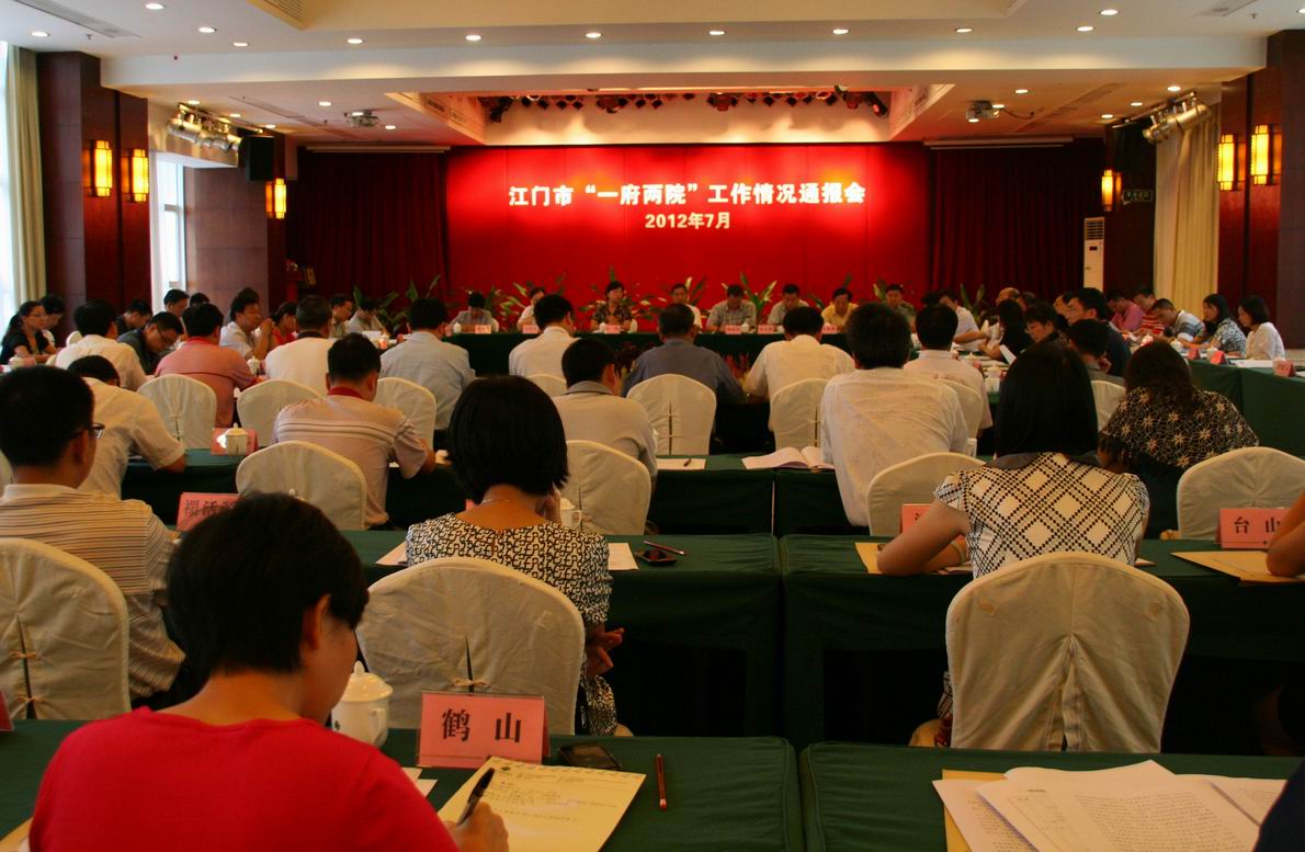 7月23日下午,江门市人大常委会举行2012年上半年“一府两院”工作情况通报会。江门市人大常委会委员及省、市人大代表小组长等出席会议。鹤山代表联组第一小组组长钟竟成、第二小组副组长李志刚参加了会议。 会议听取了江门市常务副市长黄悦胜代表市政府所作的《江门市2012年上半年经济运行和重大项目建设情况报告》,以及江门市政府关于2012年倒逼项目民生实事进展情况的报告、江门市中级人民法院2012年上半年工作情况的报告、江门市人民检察院2012年上半年工作情况的报告。 听完“一府两院”的报告后,与会人员就加大招商引资力度、促进企业增资扩产、提高政府服务水平、保障财政的民生支出、加快高速公路等基础设施建设等问题提出意见和建议,“一府两院”相关部门对有关问题给予了答复。 最后,江门市人大常委会常务副主任梁清兆就如何做好下半年各项工作强调,一要牢牢把握加快发展这个主题,全力以赴稳增长、调结构;二要牢牢把握以人为本这个核心,进一步加大民生工作力度;三要牢牢把握和谐稳定这个大局,为党的十八大召开营造良好社会环境。