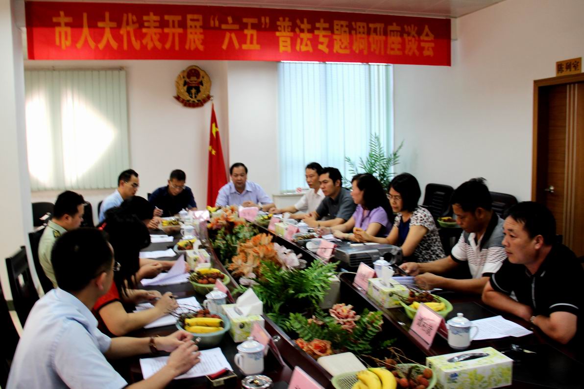 为促进我市“六五”普法工作,6月27日下午,市人大常委会副主任方长江率政法代表专业小组,到市司法局召开“六五”普法专题调研座谈会。 会上,代表们听取了市司法局关于“六五”普法工作情况汇报,观看了中小学“模拟法庭”等音像资料,并就如何克服法制宣传教育碰到的问题,加强法律“六进”、创新普法模式,建设法治文化等内容各抒己见,为做好“六五”普法工作提出了意见和建议。 方长江副主任充分肯定了我市推进“六五”普法取得的成绩,并针对“六五”普法面临的主要问题提出了意见。他强调,市政府及职能部门要继续发扬成绩,拓宽宣传教育渠道,全面调动全民普法的积极性;继续抓好法律“六进”工作,特别是要抓好在校青少年的道德与法制相结合教育;不断创新模式,培育法治文化基地,为社会建设全面进步营造良好的法治环境。