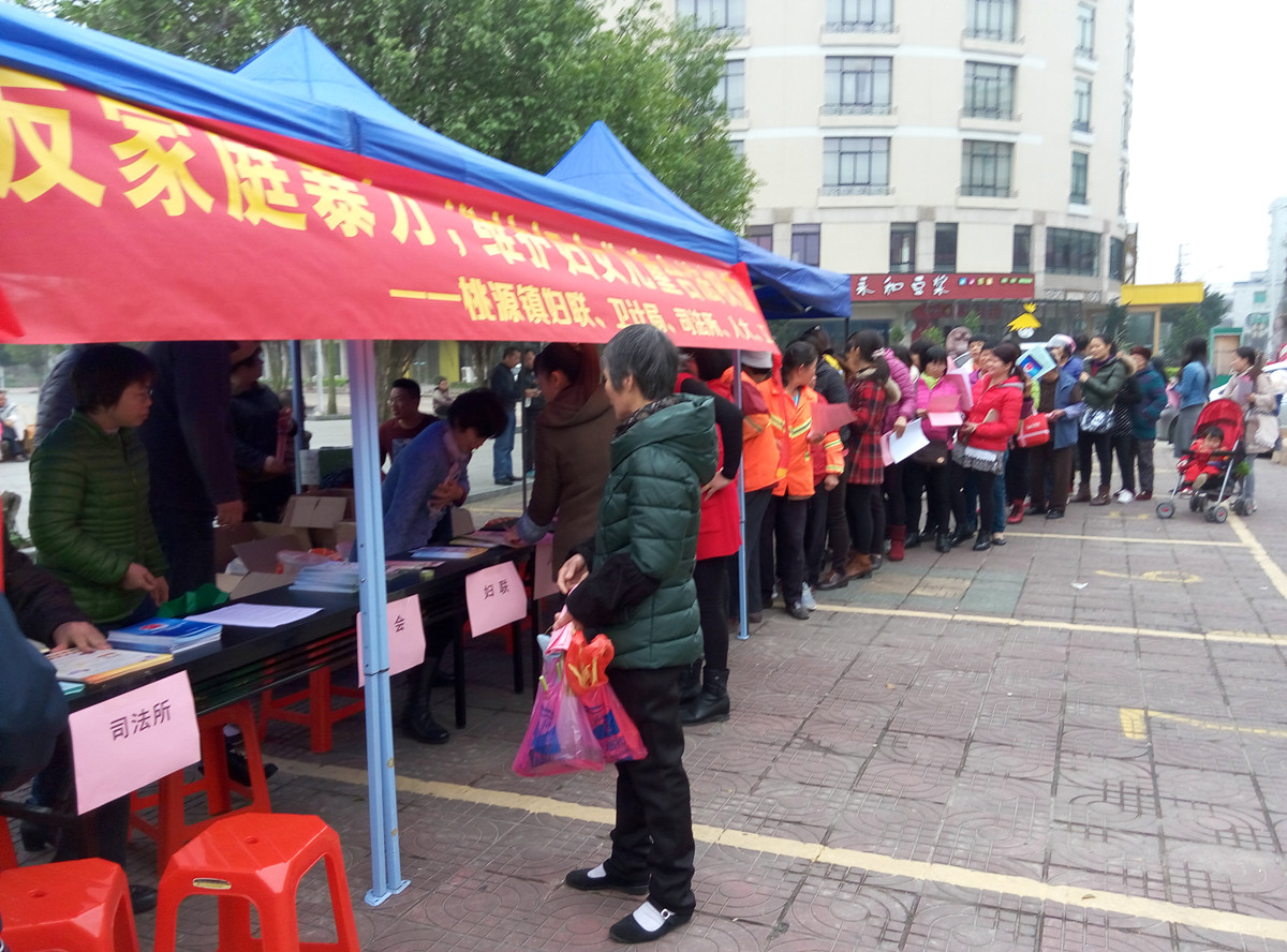 3月15日,桃源镇人大、司法所、工会、卫计局、妇联联合在桃源镇文化广场举行“全面落实二孩政策,促进人口均衡发展”和“反家庭暴力,维护妇女儿童合法权益”主题法制宣传活动,宣传《反家庭暴力法》、《未成年人保护法》、《人民调解法》等法律法规及村(居)法律顾问等知识。
